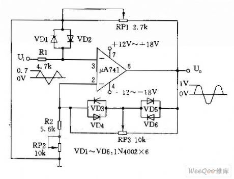 Hello! Az áramkör működéséhez kettős tápfeszültség szükséges. 5V táplálás és 741-es OPA nem jó választás. A "szinusz" jelet a háromszögjel diódával történő határolásából nyeri. Ami csak erős jóindulattal nevezhető szinusz feszültségnek és a háromszögjelnek legalább 1..2V-nál nagyobbnak kell lenni, hogy a határolás egyáltalán létrejöjjön.