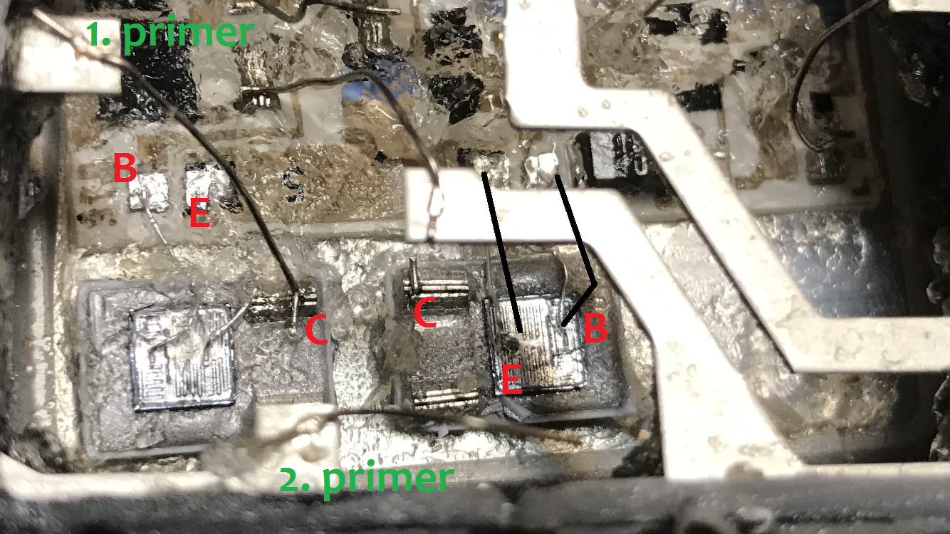 Szerintem elég problémás lehet egy ilyen kapcsolásban alkatrészt helyettesíteni. Először is kérdés, hogy mi maga az alkatrész. Ránézésre lehet tranzisztor, IGBT, FET, de lehet mellé integrált ellenállás dióda, stb., ami nem látszik, mert a chipben van. Kapcsolási rajz egy ilyen hibrid belsejéről szinte biztosan nem elérhető. A következő kérdés az, hogyan csatlakoztatod a meglévő alkatrészekhez a tokozott tranzisztort? Egy ilyen hibrid áramkörben (ahogy látható is) nem forrasztott kötések vannak. Gyári körülmények között, ultrahanggal, egyéb hegesztési eljárásokkal szinte minden fémet egymáshoz tudnak hegeszteni, amiket forrasztani körülményes, vagy lehetetlen. Hely is kicsi benne, nehezítve azzal, hogy a jó hűtés miatt nagy a hőelvonás