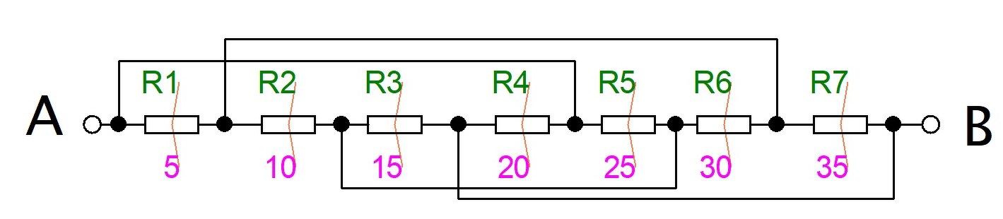 R1-R2-R5 delta kapcsolásban van, át kell alakítani csillaggá. R3-R6-R7 delta kapcsolásban van, át kell alakítani csillaggá. Utána, lehet összegezni két ágban a soros ellenállásokat. Ezután a két párhuzamos ág eredőjét számítod ki. Utána a három sorbakapcsolt ellenállás eredőjét kell kiszámolni. Végül R4 és az előbb kiszámolt ellenállás párhuzamos eredője a megoldás.