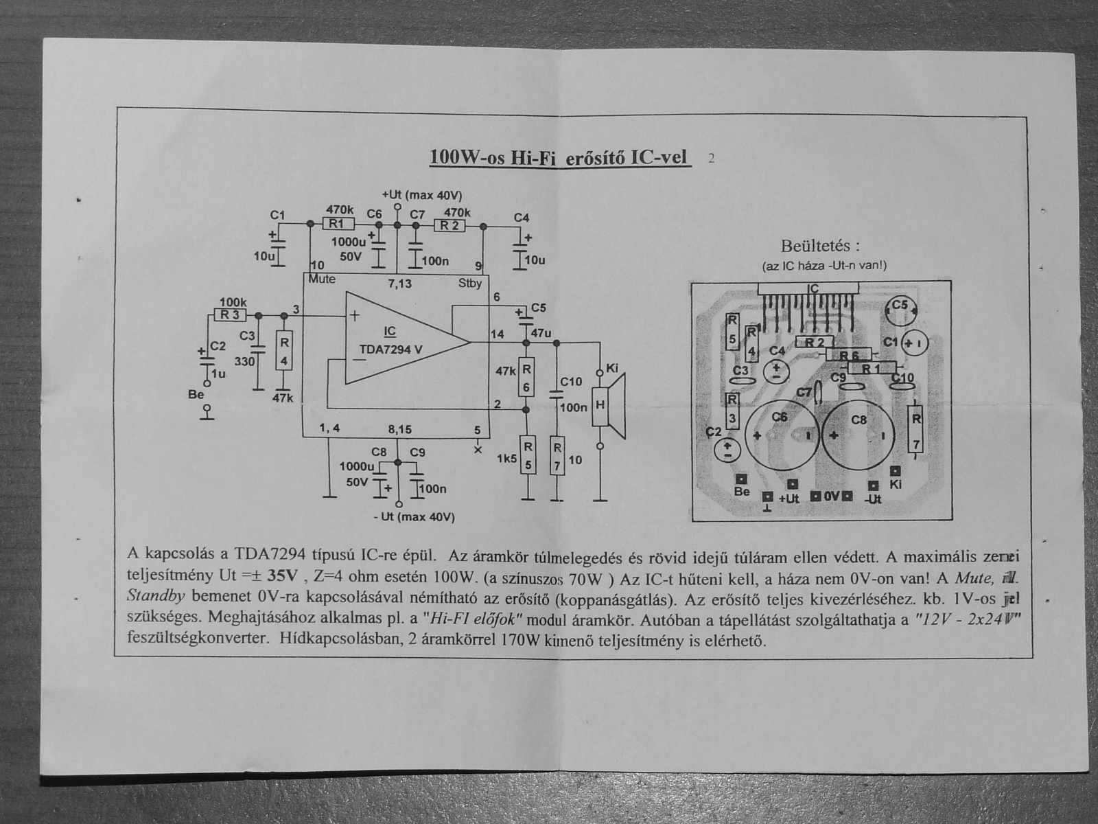 "Miért van a BCE alatt még egy E a tranzisztormérésnél?" van tranyó aminek CBE és van aminek BCE a láb kiosztása. "Milyen értéket ír ki diódamérésnél? Ellenállást?" mV -ban irja ki, a nyító feszt. 2: "A végfokot sikeresen összeraktam, de nincs hozzá tápegységem. Milyen tápot tudtok ajánlani?" ahány ohmos lesz a hangfalad attól függ. "Mit kell mérni az IC berakása előtt?" vezető sávok közöti esetleges zárlatot.. pl "Mivel szokás hűteni az IC-t?" alu hűtőbordával szokás, (in-compban 1548 ft 30*11*4 cm es) "A házat akkor egy dróttal kössem össze a -Ut-val?" NEM! a HÁZ alapban úgy van gyártva, hogy negatív tápot kapja, ezért kell elszígetelni a hűtőbordától, mert ha letestel az ic kigyúllad! (kézzel is letudod testelni..) 3: "Az ekvalizátorban az R12-R14-R16-R18 elemek nem 330, hanem 430 Ohmosak. Befolyásolja ez a szabályozott frekvenciát?" Mivel nem létezik 430ohmos ellenállás, valamit elnéztél. 4: "A végfok 1 V-ot kér bemenetként, az EQ pedig 9,6 V-ot ad le. Ilyenkor hogy lehet összeilleszteni a kettőt?" hangerőszabályzó potit tudom én is csak mondani..100kB-st pl 5: dettó ónszíppantó 6: nekem meg vasfűrészlap, néha lombfűrész. 7: mivel a marató lötyi a rézzel fog reakcióba lépni, így ahol alkoholosfilccel be van rajzolva - fedve- ott nem tud azzal reakcióba lépni. üdv