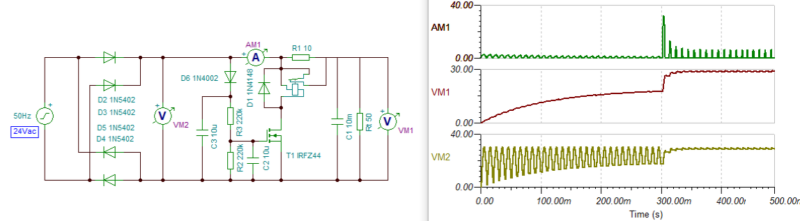 Részedről: - Én nem zénert rajzoltam az áramkörbe, hanem csak egy reverz diódát az induktív lökés miatt. - Most már nem értem a dolgot. Eddig úgy volt, hogy 24V van, és a késleltetést csak egy oldalon alakítod ki, a két 12V-os relé sorba lesz kötve és az egyik a + oldalon, a másik a - oldalon zárja rövidre az ellenállást. Most meg 15V-van és 12V-os relé. - A valós áramkörben nem simított egyenfeszültség a "15V", hanem kétutas egyenirányított jel. - Nem veszed figyelembe hogy a 10mF-os kondin terhelés is lehet. Hiszen amikor a kondi töltődik megszólalhat az erősítő (vagy mi). Így a kondi nem fog az egyenfeszültség csúcsára feltöltődni az ellenálláson keresztül, hiába várunk. Amikor pedig a relé zárja a kontaktust, még is csak lesz egy nagy lökés.. - Végezetül igazából az egész áramkörre nincs szükség, mert nálad a trafó és diódák elviselik a kondi töltésének csúcsáramát. Ha pedig még is lágyindító szükséges, akkor pedig sokkal célszerűbb a hálózati oldalon kialaktani a lágyindítót (mint sok más kapcsolásban), mer úgy a trafó lökését is lehet/kell csillapítani. Részemről: - Nem ésszerű hogy a relét a pufferoldalra kötjük, mert ha terhelés van, esetleg nem éri el a feszültség a relé meghúzási értékét. - Problémát okozhat, hogy a Fet akkor kapcsol be, amikor eléri a késleltető kondi a GS küszöbfeszültséget. Csak éppen ekkor a relé rákapcsolja puffert a trafóra, amitől feszültség visszaesés jöhet létre, ami lassítja a Fet nyitását. Szélsőséges esetben visszaeshet a relé. Végezetül leszimuláltam az áramkört, váltó táplálással, ahol a trafó 24Vac feszültséget adna. Valamint van a pufferen terhelés. Nos, itt láthatod, hogy amikor a relé bekapcsol (már nem emelkedik tovább a terhelés miatt a puffer feszültsége) még is hatalmas csúcsáram alakul ki. A VM1 a puffer feszültségét, a VM2 az egyenirányító kimenti feszültségét, az AM1 pedig az áramot. Látható, hogy a puffer töltése alatt, kb. 1,6A a töltőáram, de amikor bekapcsol a relé, még is 30A a csúcsáram. Így ezzel az erővel a táp bekapcsolásakor is kialakulhat ugyan ez a csúcs. (Természetesen és az 50 Ohm terhelést csak önkényesen választottam, hogy látható legyen mi van terhelés esetén..)