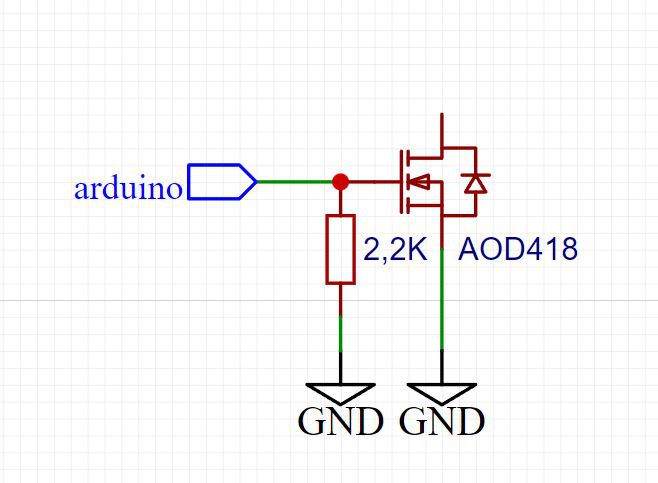 Mivel a fet biztosnságosan nyit 5V-ról is (logic level fet, 2,5V gate treshold), egyszerűen el lehet hagyni az inverter fetet. A gate-et földre kell húzni, hogy ne lebegjen, ha az arduino éppen reset-ben van.