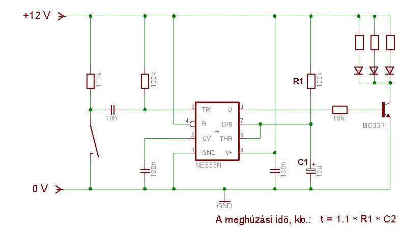 A csatolt ábrán az ajánlható kapcsolást látod, egy kondenzátor választja el a Trigger bemenetet a gombtól, így garantált, hogy minden gombnyomás elindítja az időzítőt, de minden újraindításhoz el is kell először engedni a gombot. Az értékeket úgy választod meg, ahogy Neked kell, a lényeg a kapcsolás.