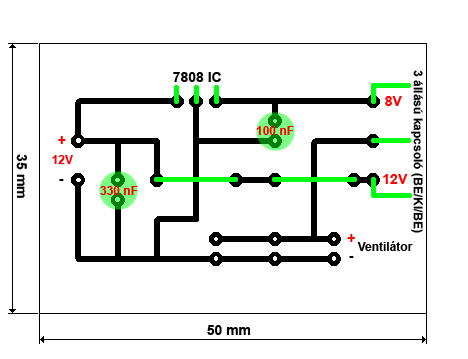 Igaz, hogy nem lett olyan mint a tiéd, de az az igazság, hogy a 45mm x 60mm-es dobozban 35mm x 50mm-es lesz a (próba) nyák és így tudtam megoldani a rajzot. Kérlek nézd át, hogy helyesen csináltam-e meg, és köszönöm az eddigi segítségedet! ![]() u.i.: Előre is bocsi a képen található színekért, csak így jobban meg tudom különböztetni a dolgokat.