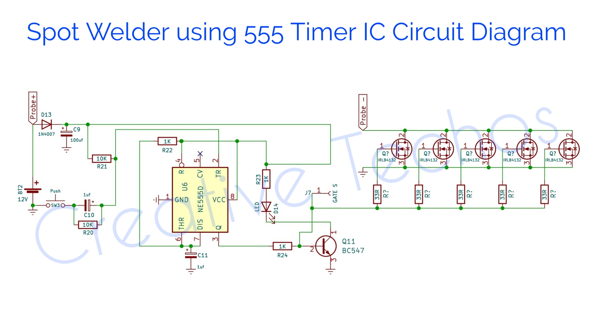 Az alábbi ponthegesztő kapcsolást szeretném elkészíteni. A Mosfet lehet IRLZ44N is változtatás nélkül? Még 1 diódát tett a fetek 1-3 csoport lábaira. Ha jól tudom ez 50 ms időzítésű. Melyik R tagot kell potméterrel helyettesíteni és milyen értéken, ha 10-200 ms időzítés között állítható lenne?