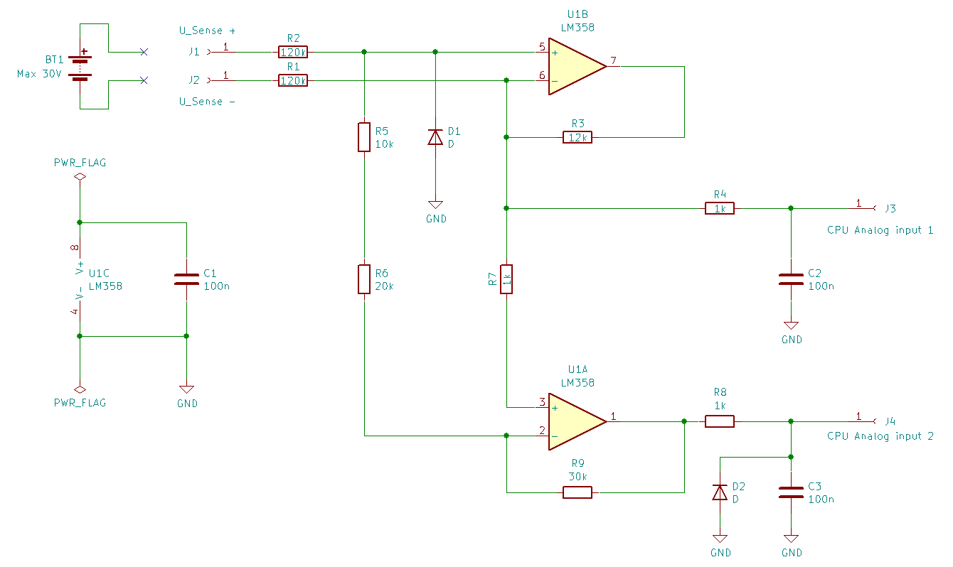 - Ha a 10k-20k közös pontja a GND-n van és a 10k az 12k, akkor az első fokozat erősítése 0,1, vagy is a 0..30V 0..3V-ként jelenik meg. - A második fokozat az első kimeneti feszültségét kapja, erősítése 2,5 (Σ 0,25) és így 0..12V bemeneti feszültségnél jelenik meg a 0..3V feszültség. - Egyébiránt az LM358 kimeneti feszültségének maximuma 5V táp esetén 3,6V..