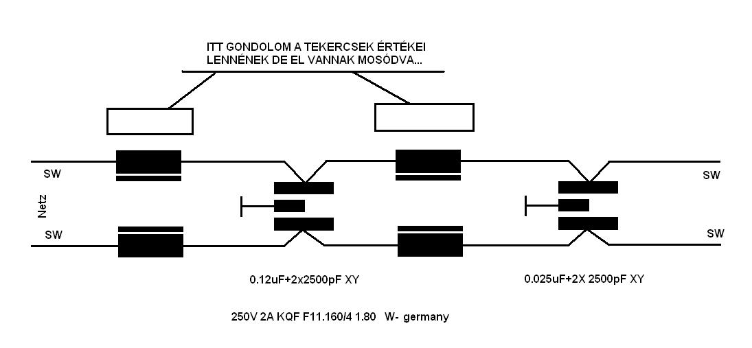 annyi az egész hogy bejön a fázis és a null a egy-egy kondival van kötve a földhöz... + az egyik oldalon van egy ellenállás a föld felé.. Majd egy-egy tekercs közös vasmagon! utána az a barnás színű kondi a fázis-nulla között.. ennyi az egész..