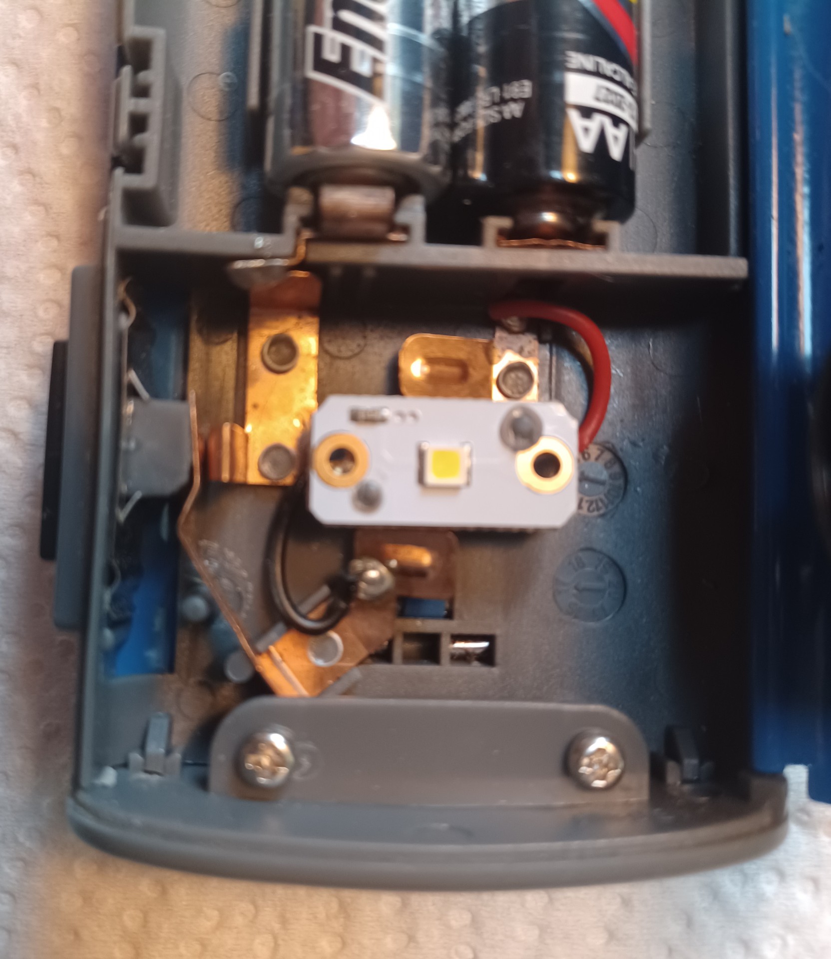 Teljesen normális(nak látszó) fehér, 5 mm-es LED. Két, domború lencsén keresztül átvilágít pici (5 mm) ábrákat kb. 20 cm-re. Után rajzoláshoz.