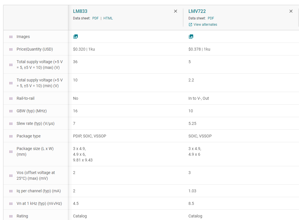 Megépítettem az alábbi kapcsolási rajzot amin a tekercs ha érzékel egy rövid áramfogyasztási impulzust akkor a műveleti erősítő kimenetén megjelenik egy 5v-os jel aminek a feszültsége arányos azzal amit a tekercs mért. LMV722-es műveleti erősítővel működik a kapcsolás, viszont keresek egy furatszerelt (DIP) tokú helyetesítőt a kizárólag SMD-ben kapható LMV722 helyett. Próbáltam az LM833-at, de annak a kimenetén folyamatosan 5v körüli feszültség jött ki attól függetlenül hogy a bemeneten mekkora impulzus volt. Miért nem működik a kapcsolás az LM833-al és mivel lehetne helyetesíteni? Csatoltam az összehasonlítását a 2 IC-nek. A választ előre is köszönöm.