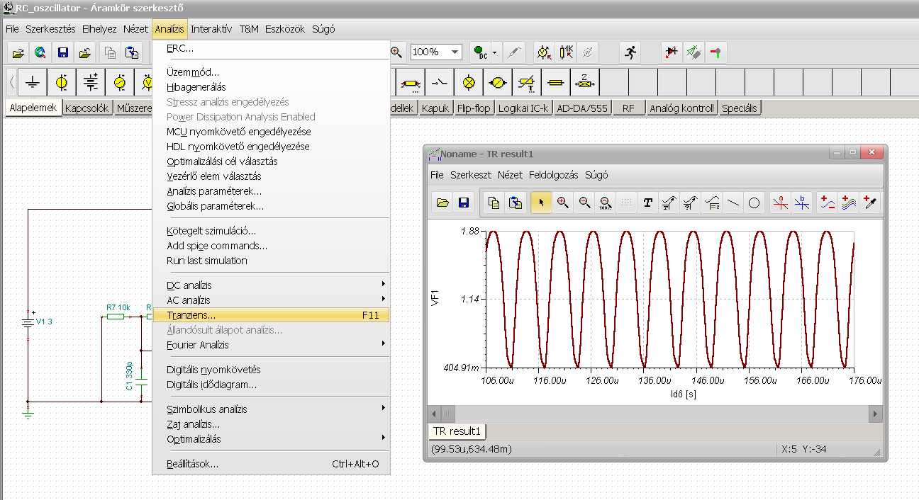 Vagy még egyszerűbb, ha kidobod a szkópot, és tranziens analízist indítasz. Ekkor egy diagram ablakot dob fel, amiben minden mérőpont grafikonját megrajzolja.