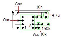 Megépítettem ezt a kapcsolást (1-es kép). Átterveztem ilyenre (2-es kép). Megcsináltam a beültetési rajzát is (3-as kép). Hozzácsatlakoztattam az ábra szerint a másik kapcsoláshoz (4-es kép). Eredmény:nem történik semmi,azon kívül hogy az 555 melegszik (4-től 9 voltig próbáltam a tápfeszültséget neki). Mi lehet a probléma?Kérlek segítsetek!
