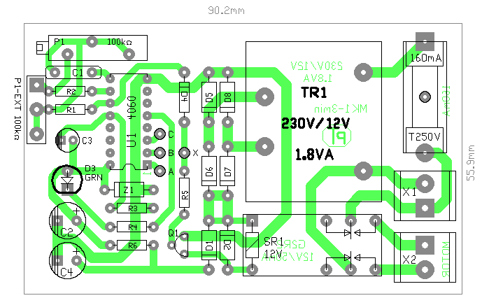 Igazából nem tudom mit nevezel egyszerű alkatrésznek, de feltevésem szerint valami kapcsolásra gondoltál, mert alapvetően létezik erre gyári un. meghúzás késleltető időrelé. Remélem, ez a megoldás elnyeri a tetszésedet. Működése: - Az áramkör alapvetően egy ütemadóból és számlálóból áll, ahol ha az ütemjelre a számlálásnak vége, meghúz egy relé. - Ha az X1 csatlakozóra megérkezik a hálózati feszültség, akkor megjelenik a tápfeszültség. A C3 kondi, törli a számlálót. Így annak minden Q kimenete alacsony szintű lesz. A relét így a tranyó, nem húzza meg. - Ha az ütemadó a számlálót ellépteti a Q13 kimenetig, akkor annak feszültsége magas szintű lesz. A tranzisztor meghúzza a relét, és a jel, a D4 diódán keresztül, megállítja az ütemadót. Így a számláló, ebben az állapotban marad, míg a tápfeszültség meg nem szűnik. - Ha megszűnt a tápfeszültség, és újra megjelenik, az egész kezdődik elölről. - Az ütemjel gyorsaságát, a P1 potival lehet szabályozni, kb. 1:3 arányban. A P1 poti, lehet egy trimmer,ha csak egyszer vagy néha akarod állítani, vagy egy rendes potit építesz az áramkörbe (Extern) - Az áramkör működését egy LEd mutatja. Ha nincs tápfeszültség sötét, ha telik a késleltetési idő villog (arányosan az ütemadón beállított sebességgel). Ha letelt az idő (relé húzva van) folyamatosan jelez. - Az áramkör a hálózati feszültséget az X1 csatlakozón keresztül kapja meg, és a motort az X2 csatira kell kötni. Biztosítva, csak a kis áramkör tápja van, a motor biztosítását az áramkör előtt célszerű beépíteni. - Az áramkör lelke, a CD4060-as CMOS IC. Tranzisztornak szinte minden megfelel ami NPN és bekötése megegyezik a BC182-vel. A trafó egy 1,8VA-es nyáktrafó. A relé OMRON G2R-2 típusú, 12V-os egyenáramú típus. - A nyomtatott áramkört úgy kell elkészíteni, hogy a rajta látható feliratok olvashatók legyenek (nem a méretszámok!) A nyákon egyetlen átkötés van, amivel egyben az időzítés programozható. Ha 1-3perc között akarod használni, az X és B pontokat kell összekötni. ("A" ponton fele akkora idők, míg a "C" ponton kétszer akkora késleltetési idők lesznek. De természetesen az ütemadó alkatrészeinek változtatásával (C1-R2-P1), és/vagy az X pont más Q kimenetre rakásával, az időzítés széles tartományok között változtatható. üdv! proli007