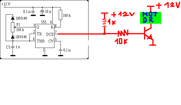 A motort kapcsolgató NPN tranyó bázisára raktál ellenállatot? Ha a discharge hajtaná a kapcsolótranyót akkor felhúzóellenállás is kell. Mert a dsc az egy belső NPN kivezetett collectora.