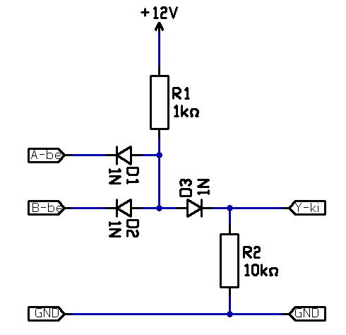 Csak azért, ha GG válasza nem lenne elég érthető számodra. De ez valóban eredetileg egy diódás ÉS kapcsolás. (D3 és R2 csak azért szükséges, mert ha nincs benn, akkor a kimenő feszültség, D1 vagy D2 dióda nyitófeszültségével magasabb lenne, mint a minimum) Persze ez egy erősen elvi megoldás, de azért működőképes Legalább is 10V )és pozitív) maximális bemenő feszültségig. üdv! proli007