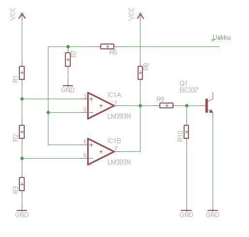 (Nem néztem utána, hogy az LM393 is nyitott kollektoros .)A kapcsolás, amit linkeltél, jó lenne, viszont tom75 kapcsolása a felhúzóellenállásokkal sem lenne jó, a diódák miatt. Itt egy felhúzóellenállásos, csak a két referenciafeszültség közötti akkufeszültségnél vezető Q1 tranzisztoros kapcsolás: