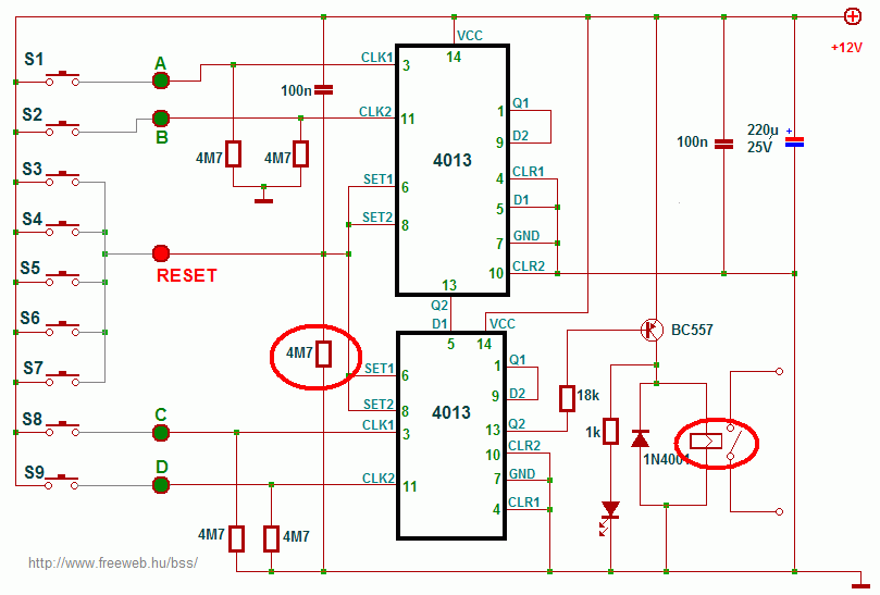 A képen bal oldalon bekarikázott alkatrész egy 4,7 MegaOhm értékű ellenállás, a jobb oldalon bekarikázott alkatrész pedig egy jelfogó (relé). Ez utóbbinak a bal oldala a tekercset szimbolizálja, amely az érintkezőket mozgatja, míg a jobb oldala (a kapcsolószerűség) az érintkezőket.)