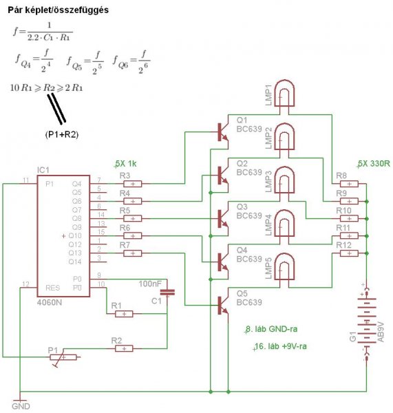 Szia! Bocs, nem este 11-kor kellett volna rajzolgatni... Az izzók elé 33 ohm ellenállás kell, azaz a rajzon elírtam! Mindjárt számolgatok egy kicsit. Trimmert vegyél szerintem, mert akkor állítható lesz! Kb. 50Ft körül megúszod, és nem foglal sokkal több helyet. Igaz 3lába van, de csak 2t kell bekötni, mert nem feszültségosztóként fogod használni.... Leírom majd, hogy melyik kivezetésen milyen gyors villogás lesz.