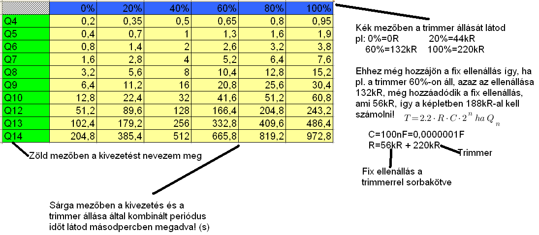 Így elég széles tartományban állíthatod a periódusidőt. Természetesen azt a kivezetést használod fel a kapcsolgatásra amelyik szimpatikus. A mellékelt rajzban láthatod a trimmer által beállított időd az adott kivezetésen. A számított értékek, max. irányadónak jók, tehát nem pontosak, már csak az értékek is kerekítettek, amiket írtam, de függ a pontos ellenállástól, trimmertől, konditól/szivárgásától, és az oszcillátor sem biztos, hogy halál pontos. Remélem, minden érhető! Üdv!