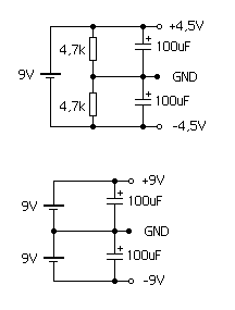 A felső egy ellenállásosztós megoldás, 9 voltot egyenlő arányban osztja le 4,5 - 4,5 voltra. Ennek a megoldásnak sajnos az a hátránya, hogy nagyobb terheléseknél az ellenállásokon jelentős feszültség eshet. Ha a ez huzamosabb, akkor ezt a kondik se tudják kijátszani. Az alsó "korrektebb" megoldás, két kilencvoltos elem sorbakötve, plusz kondik... Ez stabilabb! Remélem tudtam segíteni!