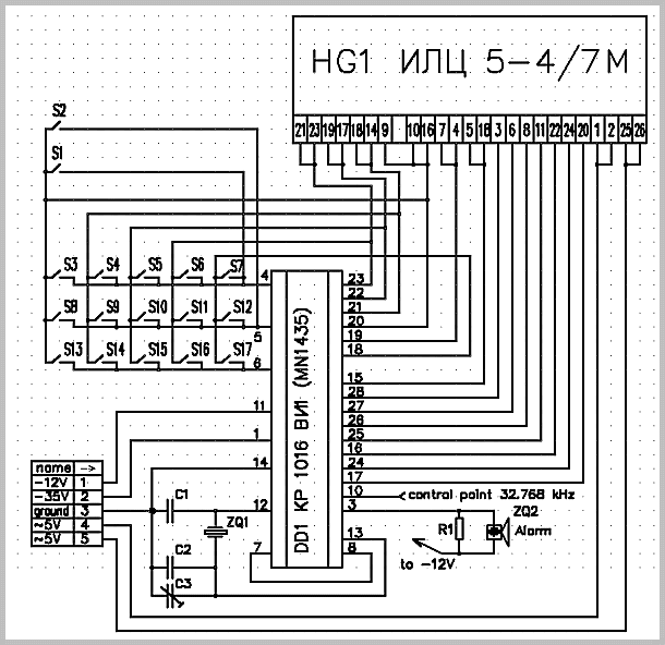 Mivel sok a félreinformáció, megosztom amit tudok a K176IE18 (K176IE12)- K176IE13- K176ID3 trióról. IE18- szolgáltatja az alap órajeleket, 1Hz(4) pontvillogtatásra (ez nyitott kollektoros), 2Hz(6) óraállításra, 1/60Hz(10) percszámlálónak. Továbbá a T1-4(1,2,3,15) kimenete a számjegyek rácsainak mátrixolására 128Hz-es 1/4 kitöltésű jelet ad, ennek a szinkronizálása az IE13-mal az R(5) bemeneten történik. Plusz van benne hangenerátor HS, engedélyező bemenete a (9) láb, kemete a (7) láb.