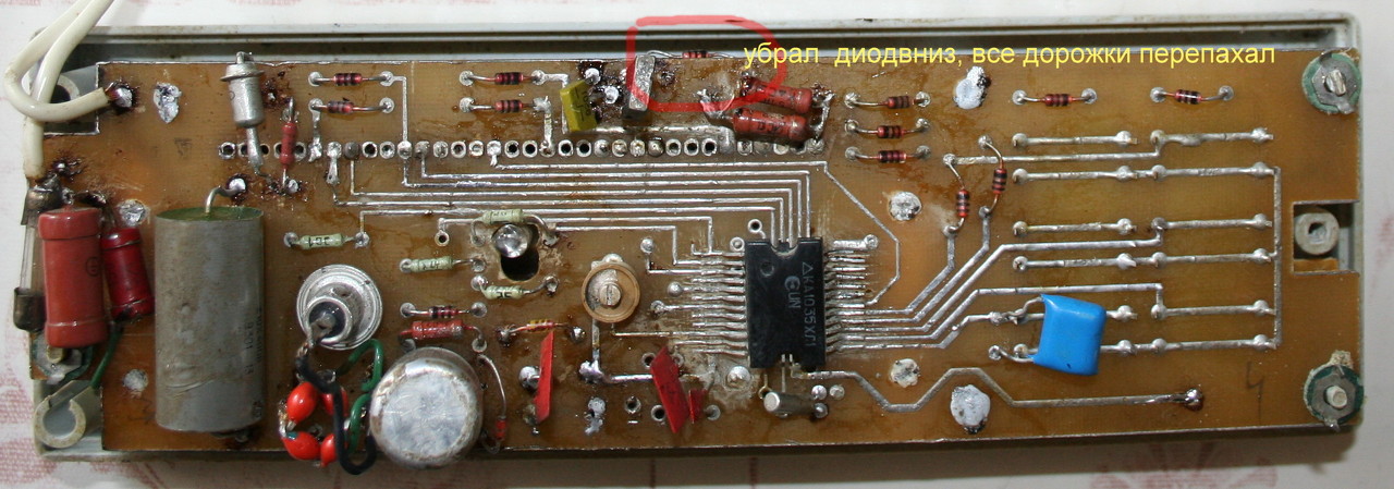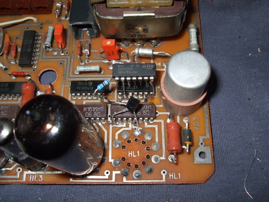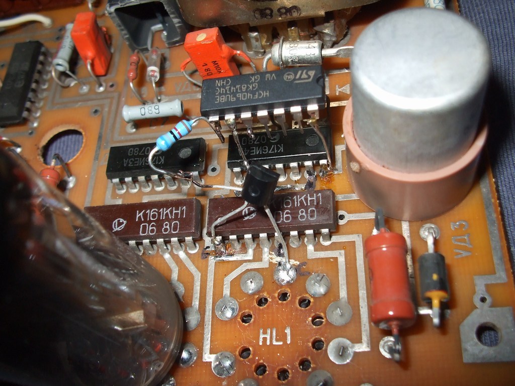 Na, probléma megoldva. CD4069-es inverter megfordítja a K176NE4 kimenetét és egy 65K ellenálláson keresztül kapcsolja a BC212 tranzisztor bázisát, ami meg a csőszegmenst vezérli. Természetesen az eredeti útvonalat átreszeltem a nyákon. Köszönöm mindenkinek a segítséget. A képeken jól látszik az "elegáns" megoldás.