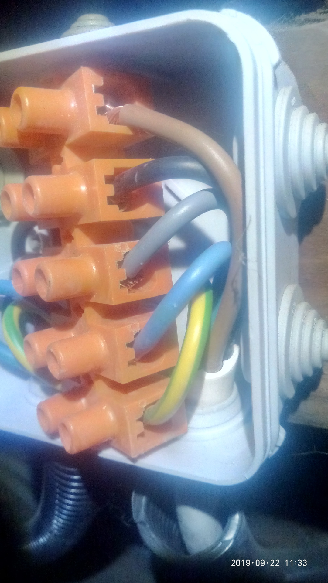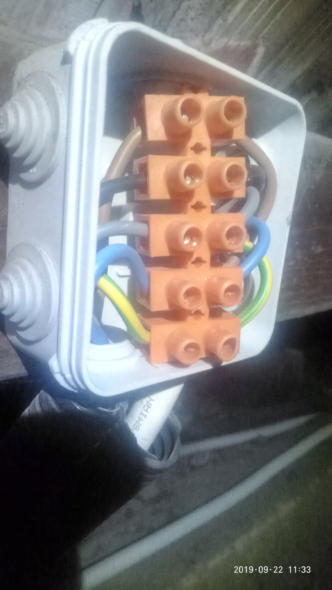 A szürke vezeték volt érdekesen bekötve, a kimenő (bal oldalon a szigetelést lyukasztotta át a csavar, de legalább hosszan volt leszedve a szigetelés, így a túloldali csavar is tartotta.