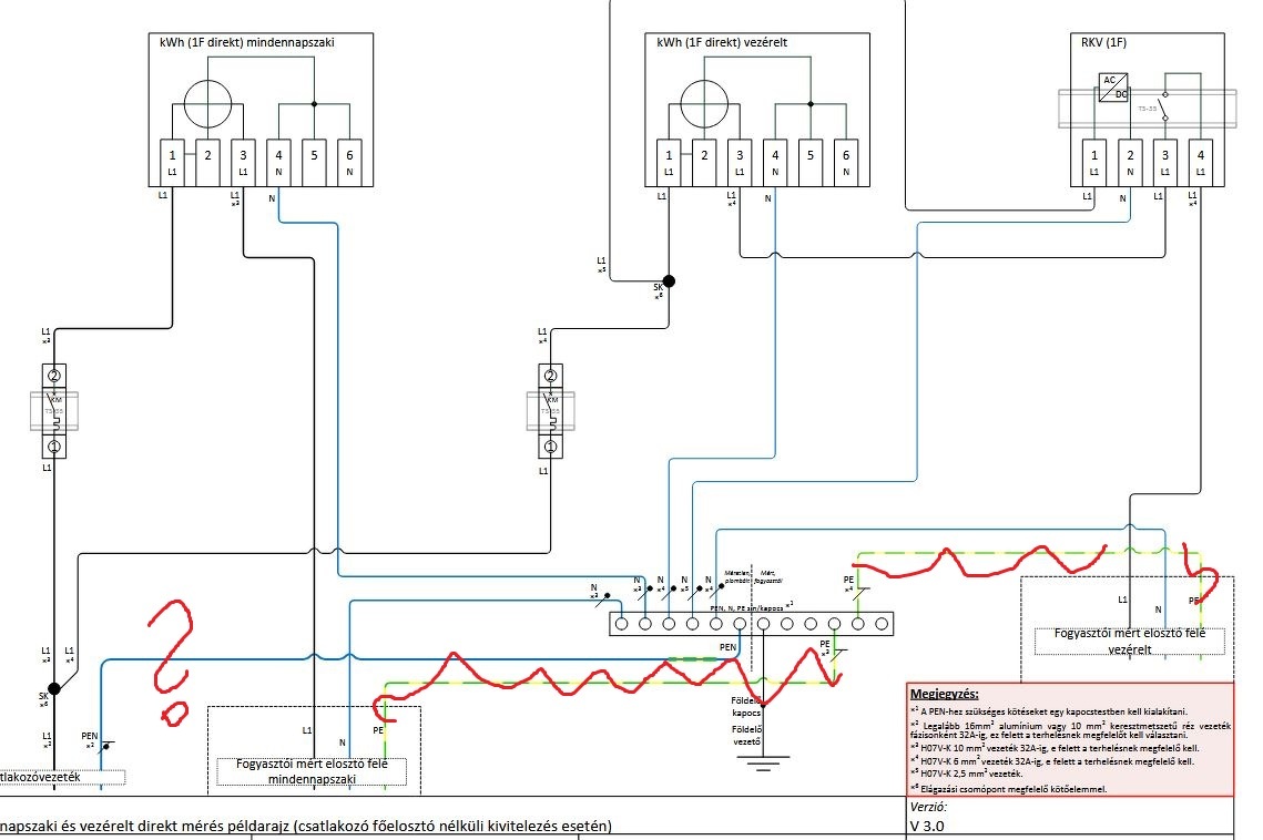 Nekem ez most így néz ki. Azt hogy a vezérelt óra és a vezérlő rá van e kötve a pen sínre, vagy egyenesen a pen vezeték megy bele azt nem látom, (az a rész plombált) de azt igen, hogy a direkt órából jövő n. vezeték az óra után össze van kötve a földelőszondáról jövő szép vastag alumínium vezetékkel, és csak nullaként megy a házba. Az első kötődobozban,(kb.4 méter) van szétszedve (n) + védőföldre.