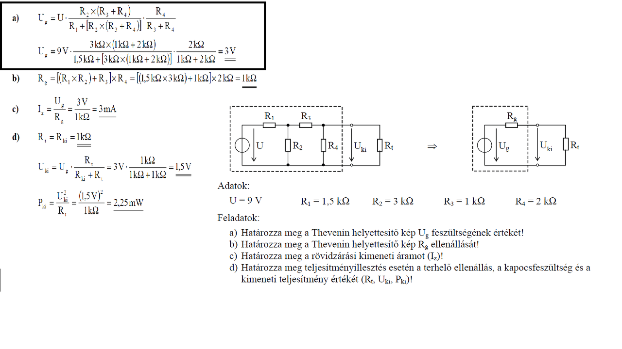 Az a) kiszámítja az üresjárási (=terheletlen, azaz Rt nincs) feszültséget. A képlet is jelzi (két tört szorzata), hogy két feszültségosztás történik a 4 ellenállással. Először az R1 és R3 közös pontjára, és ez az első tört. Láthatjuk, hogy a feszültségosztó fölső ága az R1 ellenállás, míg alul az R2 párhuzamosan van kötve az R3,R4-gyel - utóbbiak sorosak. Az alsó ág tehát R2×(R3+R4). Ezt követően jön a második leosztás az R3 és R4-gyel.