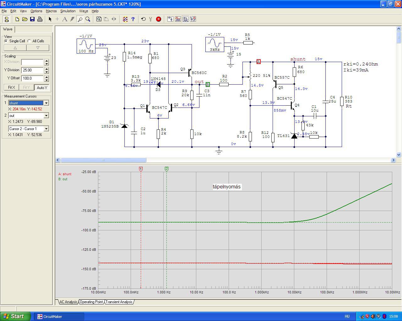 Sokat játszottam a maranztal. Átmodoltál benne ezt azt, ami aztán vagy jó vagy nem. Most úgy látom, hogy pl. a tranyót amit kihagytál belőle azt a tervezői nem véletlenül tették bele. Ha elkezdek játszani a bemenő és a kimenő jel nagyságával, meg a visszacsatolással akkor 1 nagyságrenddel jobb az eredeti verzió mint a V4-ed. Úgy általában, mert nagy kivezérlésen lehet hogy kettővel is de már nem emlékszem.