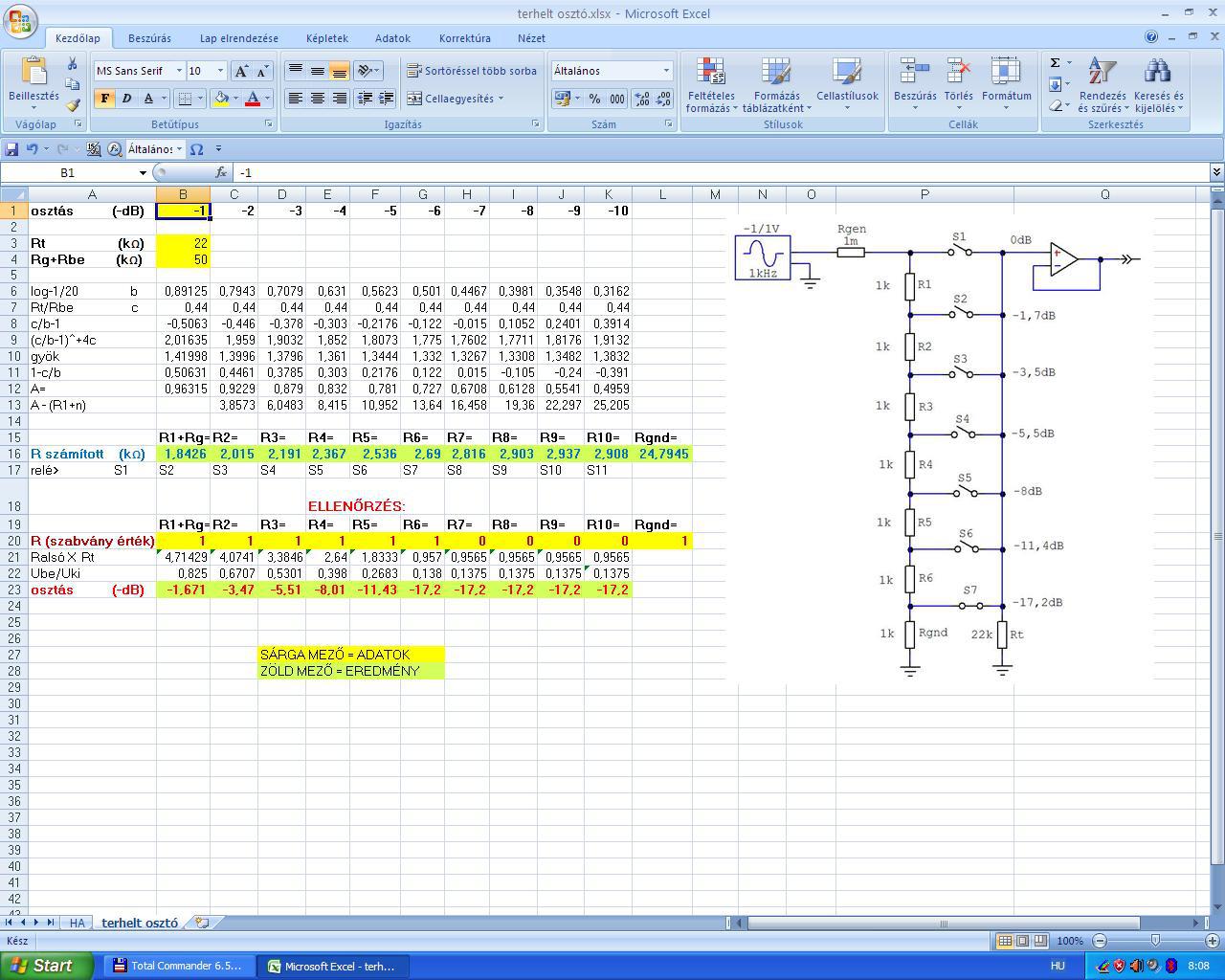 Nem tudom használ-e valaki lépcsős feszültségosztót... nekem ez a kedvenc hangerőszabályzóm, ez van a legutóbbi előerősítőmben is. Az a legnagyobb gond vele, hogy a terhelt (lépcsős) osztó átvitelét nagyon nehéz kiszámolni, vagy csak én vagyok béna. A második programozható Casio zsebszámolóm is beadta a kulcsot az utolsó elemcserénél - megkérdezte, hogy akkor most mi legyen? - és mást nem is csinált. Megmutattam neki mi legyen. Amúgy is haragudtam rá, mert pár óra alatt lezabálta az elemet, már alig mertem elővenni a fiókból, de még álltó helyében is képes volt lemeríteni. Az előző Casio magától átírta a programokat, ha háromnál több volt benne. Casio-t soha többé nem veszek, más meg nem gyárt ilyet, vagy csak én nem találok egyet sem a neten. Kínomban addig nyomkodtam az Excelt, míg bele nem erőszakoltam az egyenletet. Biztosan meg lehetne oldani elegánsabban is, de egy hete még szorozni sem tudtam vele. Kiteszem, hátha akad valaki akinek segít valamiben, például a lépcsős feszültségosztó számolásában. Egyszerű másolással lehet bővíteni az osztók számát, ha szükséges. Csak három adatot kell belepötyögni: mekkora legyen az osztó bemeneti ellenállása, mekkora a terhelő ellenállás és, hogy hány dB legyen osztásköz. A többit nem tudom, hogy, de megcsinálja.