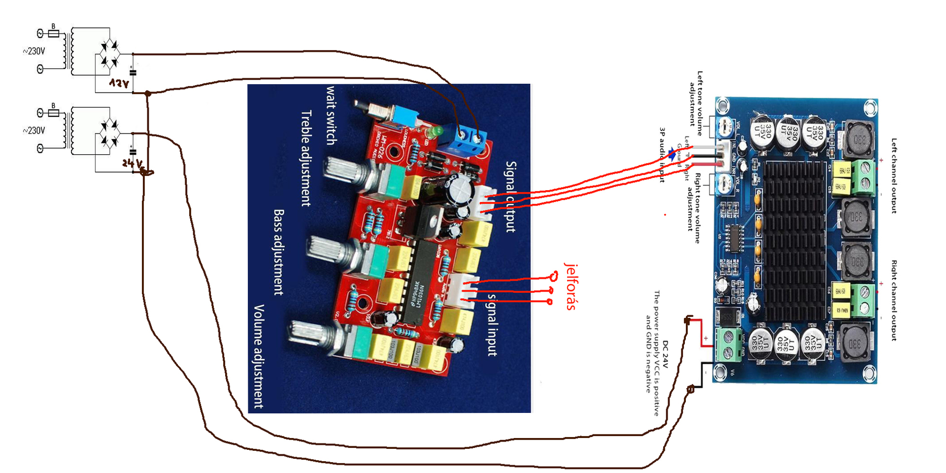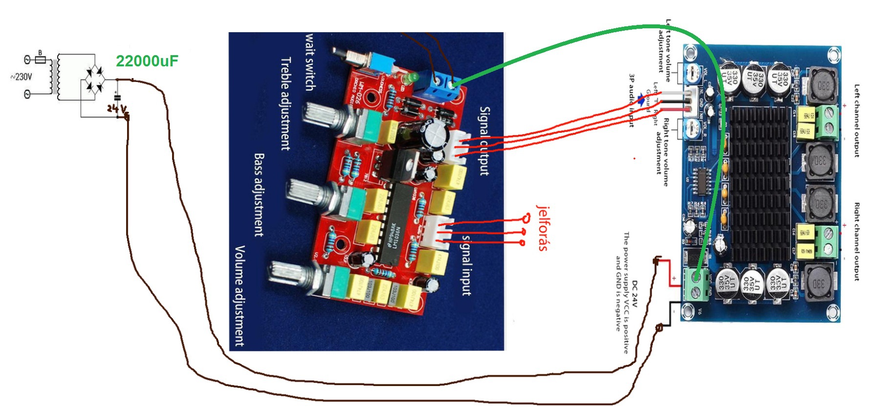 Az előerősítőnek mindegy melyik tápbemenetére kötöd a végfok 24V-os tápját, mert diódahíd van rajta, ezért mindenféleképpen megkapva a delejt. Azonkívül ott van rajta egy 12V-os stabkocka, ami biztosítja az LM IC stabil feszültségét. Az AC kapcsokon akkora feszültségnek kell lennie, hogy a stabkocka után elegendő feszültség maradjon az LM IC-nek. Bár az 9V-tól már üzemel, de ha már stab IC van a tápkörben, akkor annak illik a névleges kimeneti feszültség feletti bemenő feszültséget kapnia. Persze ot van még a dropfeszültség, ami a stab IC-k esetén a minimális be és kimeneti feszültség közötti érték. Egy normál, tehát nem speciális LDO stab esetén ez 2-3V, de kis áramoknál 1,5V a minimum. Ott van még legalább 1 darab dióda is az AC bemeneten, tehát 14-15V felett kell legyen a betáp. A GND-t elég ha a végfokról kapja. Zöld vonallal rajzoltam egy vezetéket, ezen kapja a tápfeszt. Bár tisztán analóg az előfokod, azaz nem termel kapcsolási zajt, itt is lesz GND-n keresztüli kommunikáció. Ez főleg BT modulok táplálása esetén okoz hallható kerregést. Neked ilyen baj nem lesz, de ha maximalista akarsz lenni, a zöld vezeték helyére egy ellenállást tehetsz. A végfok 24V-ját, az előfok minimális 15V-ját, valamint az előfok IC maximális 45mA-es áramfelvételét figyelembe véve egy legfeljebb 200 Ohmos ellenállást használj. Ezt 0,45W fűti maximum. Ajánlok inkább 100 Ohm/0,5-1W ellenállást ide.