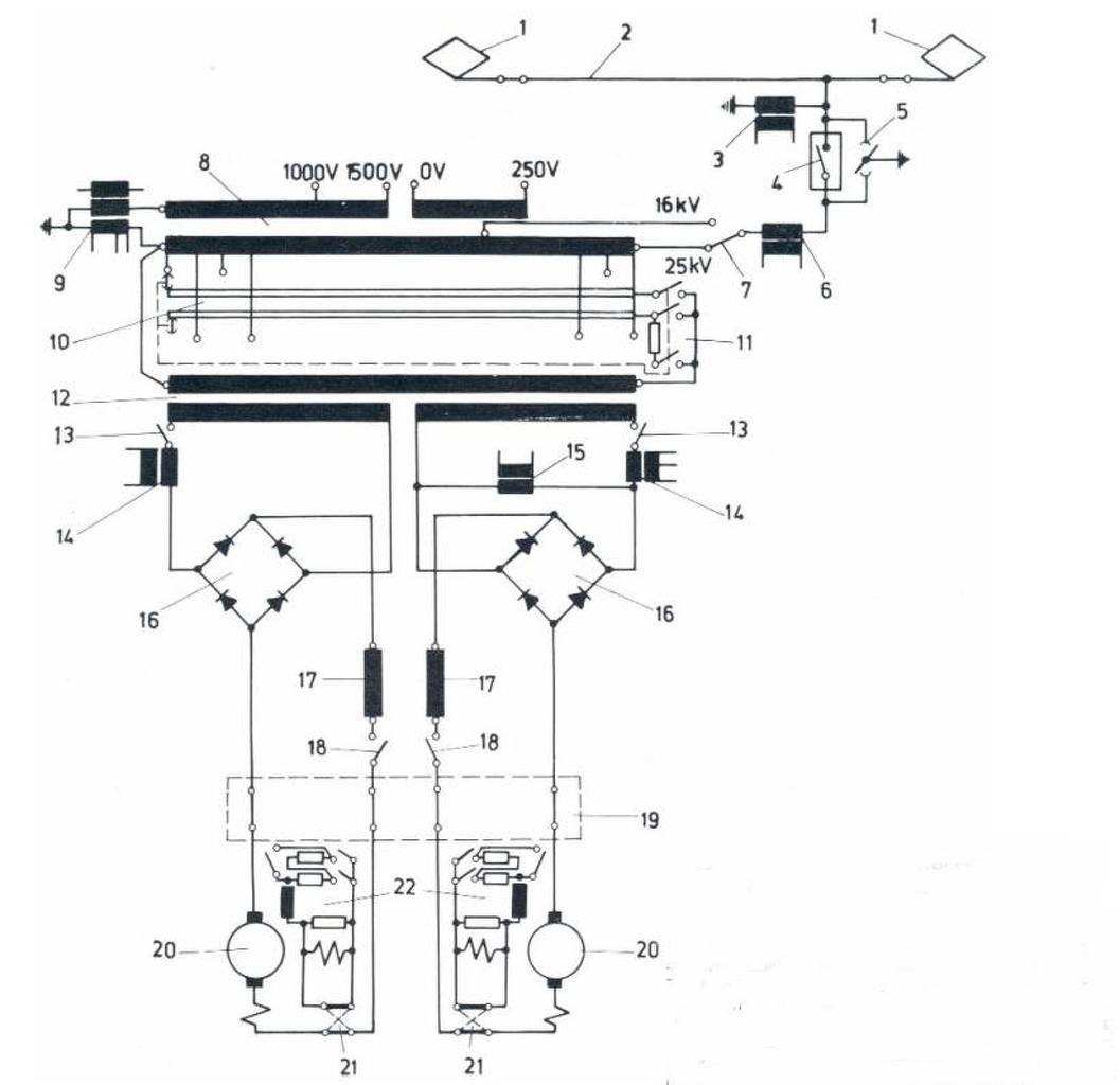 De inkább ez csak egy 25Kv-ról, fokozatkapcsolós teljesítményszabályzással meghajtott egyenáramú villanymotor, mert semmi segédüzemi berendezést nem tartalmaz. 1 - áramszedő, 2 - tetővezeték. 3 - primer feszültségváltó. 4 - fömegszakító. 5 - földelókapcsoló. 6 - primer áramváltó, 7 - feszültség-átkapcsoló, 8 - főtranszformátor szabályozó transzformátora. 9 - különbözeti védelem áramváltója. 10 - fokozatkapcsoló választóhenger. 11 - fokozatkapcsoló teljesítménykapcsolói, 12 - főtranszformátor módosító transzformátora, 13 - váltakozóáramú kontaktorok. 14 - vontatómotor-áramváltók, 15 - vontatómotor-feszültségváltó, 16 - főüzemi egyenirányítók. 17 - simító fojtótekercsek. 18 - egyenáramú kontaktorok, 19 - selejtező kapcsoló, 20 - vontatómotorok. 21 - irányváltók. 22 - mezőgyengítő berendezés