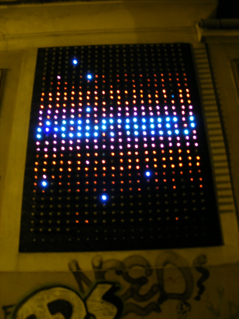 Azóta megszámoltam pontosan, és 30x20-as a LED fal, tehát 1200db góliát elem, 600db RGB LED kellett hozzá, plusz még jó pár passzív elem... Ha a góliát elemek darabját 50Ft-ért vették, akkor 60.000Ft-ba kerültek csak az elemek. Ennyi pénzből már simán összedobtak volna egy autóakku+napelem párost... Bár 20x30x3(szín)x10mA/2(mert kb. 50%-os kitöltéssel volt hajtva)=9A. Viszont így a környezetet is védenék... Még mindig nagyon kíváncsi vagyok, hogy vajon mi lesz a 600db RGB LED-del... Én szívesen elfogadnám...