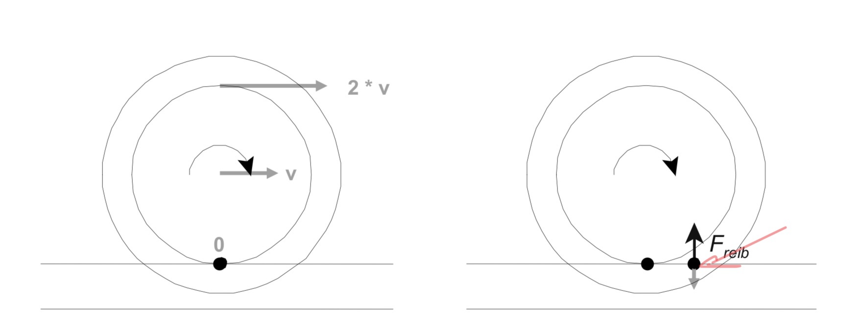 A második képen a kerék egyenesben, jobb oldalon meg kanyarban. A pontok jelölik, hol érintkezim a keréka. Sinnel, és látahtod, hogy a jobboldali képen egyszerre két pontban más kerületen ami okvetlenül csuszást, azaz nyikorgást okoz.