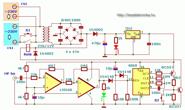 Mikor megnyomjuk az S1 kapcsolót, feszültség alá kerül az áramkör. A 10µF-os kondin és az 1N4148-on keresztül resetelődik a 4060, így behúzza a relét a tranzisztorokon keresztül, ezáltal egy öntartás jön létre. Viszont az időzítés is elindul. Eddig még nem volt bemenő jel! Ha bemenő jel érkezik, akkor mindig újraindul a visszaszámlálás, és addig folyamatosan be van húzva a relé. Ha fix 12V-ra kapcsolom az áramkört, akkor kivéve a 10µF-ot, az 1N4148-at, és a 10k-t, elvileg csak akkor húz be a relé, ha zene érkezik a HF be csatlakozóra. Nemsokára megépítem, és beszámolok a tapasztalatokról! Egyéb észrevételt, esetleg egyszerűbb kapcsolást szívesen megnézek! Üdv!