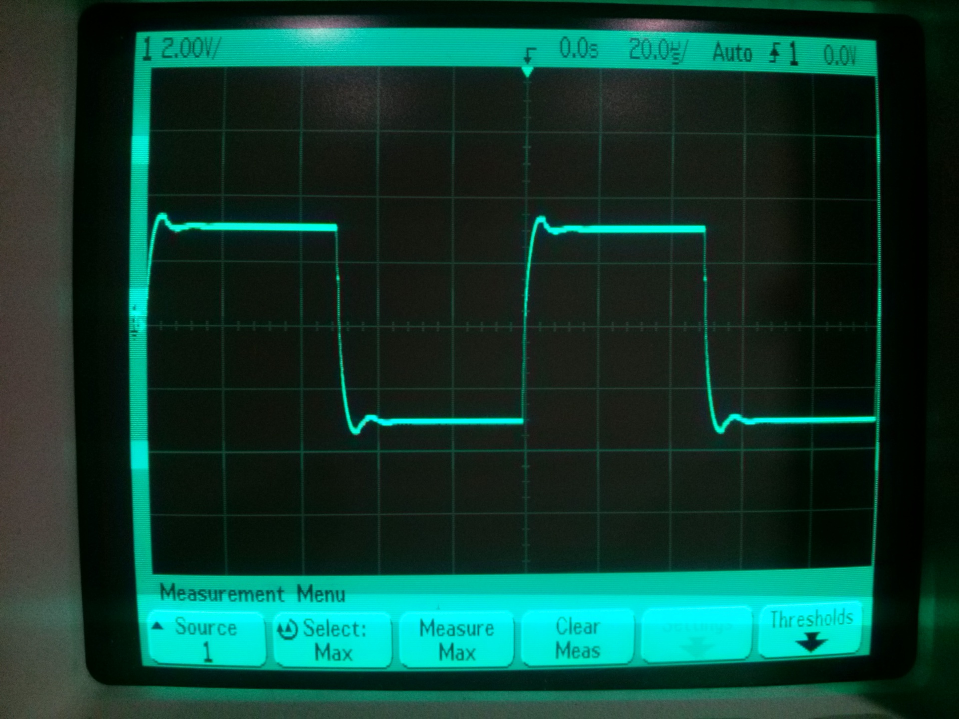 Ami még érdekes lehet... a 10Hz-es négyszögjel a kimeneten, majd a pozitív tápfeszen mérve és a 10kHz 1µF/8Ohm és végül amit a szimulátor mutatott.