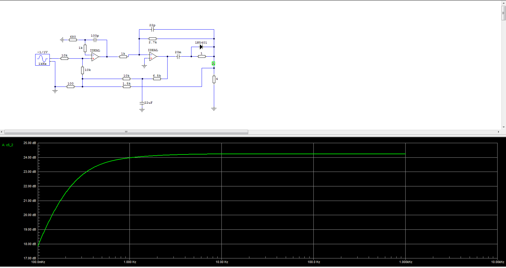 Ezzel dél óta szívok folyamatosan. Azt gondoltam, hogy opampos integrátor jó nagy időállandóval oszt kész, de sehogy nem jött össze. Újabb töréspontot nem szabad belevinni, vagy legalábbis nekem sikerül úgy elfogadhatóra megcsinálnom. Maradt ez a Quados módszer, de ez sem volt egyszerű. A pufferrt nem szabad 100µF-ra csökkenteni, mert fázishibát okoz, az 1mF-ossal meg nagyon lassú a szimuláció, de ezt kellet választani.