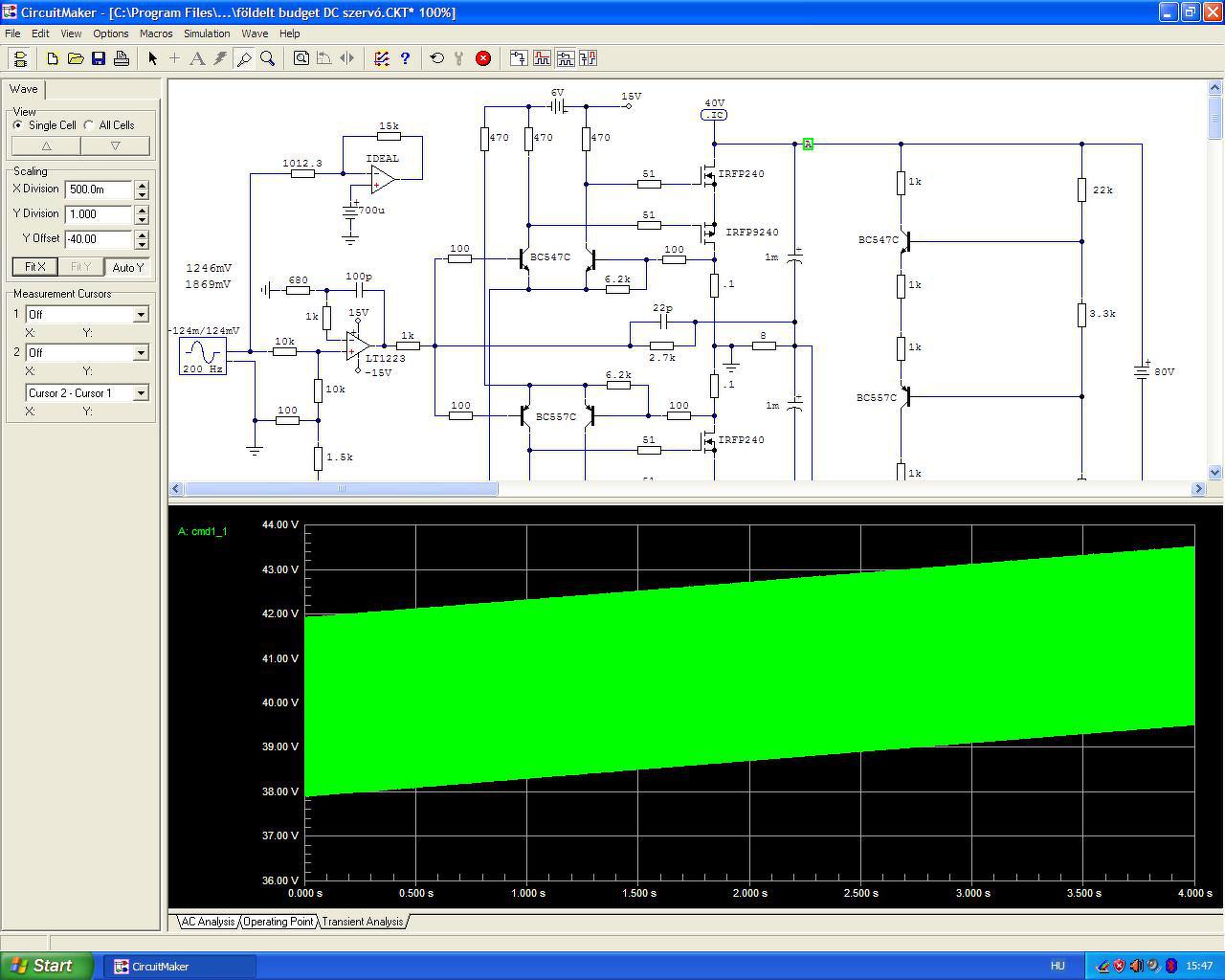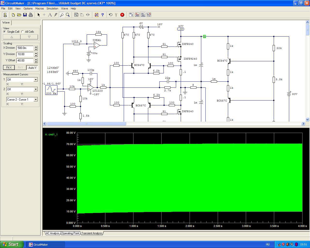 Viszonylag ritkán nézek be, ezért nem követtem végig ennek az erősítőnek az útját itt. De most hogy a kapcsolást nézem, felmerült bennem egy kérdés: mi történik amikor az erősítő ki van vezérelve, hogyan oszlik meg a maradék feszültség a sorba kapcsolt P és N csatornás FET között? Nézted szimulációban és a gyakorlatban a feteken eső feszültségeket?