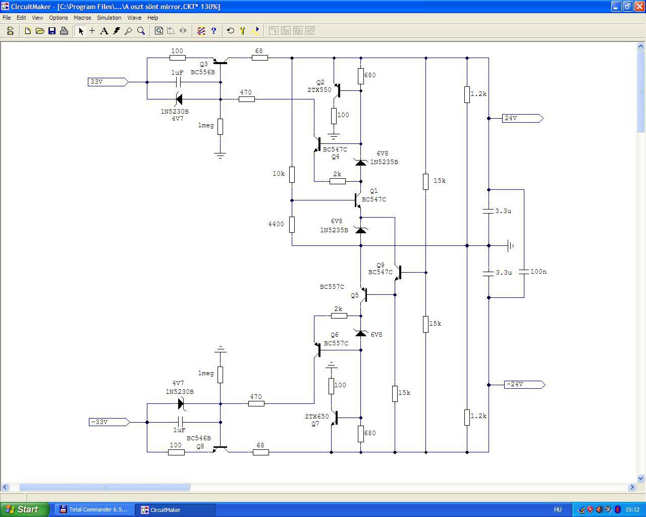 Az eddig leírtak csak amiatt kellettek, hogy látni lehessen milyen rögös úton jutottam el egy nagyon egyszerű észrevételhez. A tápelnyomása ugyan szerény ennek a fokozatnak, de csak akkor ha külön-külön zavarom be valamelyik féltápot, vagy közösmódusban egyszerre mindkettőt. De mivel szimmetrikus felépítésű, így ha a tápfeszültség változás is szimmetrikus - pl. +/- 25 V, vagy +/- 23 V-ra változtatom - arra kevésbé érzékeny. A két egymástól független feszültségstabilizátor nem törődik azzal mit csinál a másik. Mindkettő önálló életet él és arra "kalimpál" amerre akar. Mindkettő beleviszi a saját zavarjelét. Viszont ha az egyik tápot megtükrözöm, jelentős mértékben érzéketlenné válik az erősítő a tápegység - most már szimmetrikus - zavaraira. A THD javulás 46 dB. Tehát söntszabályzó és tükrözött táp. Esetleg még az előreszabályozás is. Egyre izgibb mit fog lépni erre... de még tovább mókolok - magával a kapcsolással - hátha eszembe jut valami épkézláb ötlet mielőtt megcsinálnám.
