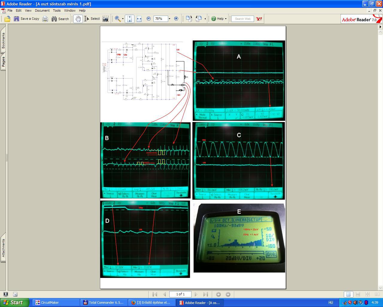 A kapcsolási rajzon a mért feszültségszintek. Az xls.-ben a pozitív táp kimeneti feszültségváltozása a bekapcsolástól 1000 mp-ig, 10 másodperces intervallumban. A pdf.-ben néhány alapmérés. Van néhány paraméter melyek meghaladják a "műszereim" felbontóképességét. Ui: elfelejtettem szólni az utólag betett R25 (220k) ellenállás szerepéről. Ha rövidre zártam a negatív tápot, nem éledt fel mert elfogyott Q8 bázis árama. Ezt a célt szolgálja. Az "A" szkóp képen a kimeneti kisfrekvenciás zaj. Ennek forrása a (D3) Zener - mint feszültség referencia - saját zaja. Kisebb, mint 0.5 mVpp. A negatív táp ezt megtükrözi. +Uki zaj - (-)Uki=0. Közel nulla. A kivonás műveletét a meghajtó fokozat tápelnyomása fogja elvégezni (majd ezt is megmérem, de ezekkel a műszerekkel szerintem nem fogom tudni). A "B" képen a dinamikus viselkedés. Ez a "mérés" komolytalan de érdekes. Egy 10k ellenállást "nyomogattam" hol a pozítív, hol a negatív tápkimenethez. Ami látható: a negatív táp kimeneti impedanciája kb. fele a pozitív tápénak, valamint, hogy szépen megtükrözi a pozitív táp kimeneti feszültségingadozásait. A"C" képen a tápelnyomás. A puffer "brumm feszültsége" nyomokban sem látható, csak a szkóp saját zaja. A "D" képen a hálózati feszültségingadozás okozta kimeneti feszültségszint ingadozása. Ezt úgy "szokom" előidézni, hogy bekapcsolom a 2 kW-os hősugárzót, mire a hálózati fesz. 231 V-ról 229 V-ra esik le. A 24 V-os kimeneten csak a Zener saját zaja van jelen, a feszültségesés nem látható. "E" kép. Van egy ilyen kis játék kézi analizátorom. Ez a saját zaja rövidre zárt bemenettel (60-70 uV közötti értéket mutat feszültség állásban, szűrő nélkül). Ha a 24 V-os tápkimenetet mérem vele, ugyanezt mutatja - tehát nem fényképeztem le kétszer ugyanazt. A laptopot és a külső hangkártyát (vagy mit) meg lusta voltam emiatt elővenni emiatt a mérés miatt. Ekkora kimeneti zaj nekem megfelel, amit ezzel a bigyóval nem tudok megmérni. Majd folytatom a mérést a meghajtófokozat plusz söntszabályzó együttesével. Kíváncsi leszek rá. A hozzászólás módosítva: Júl 30, 2022
