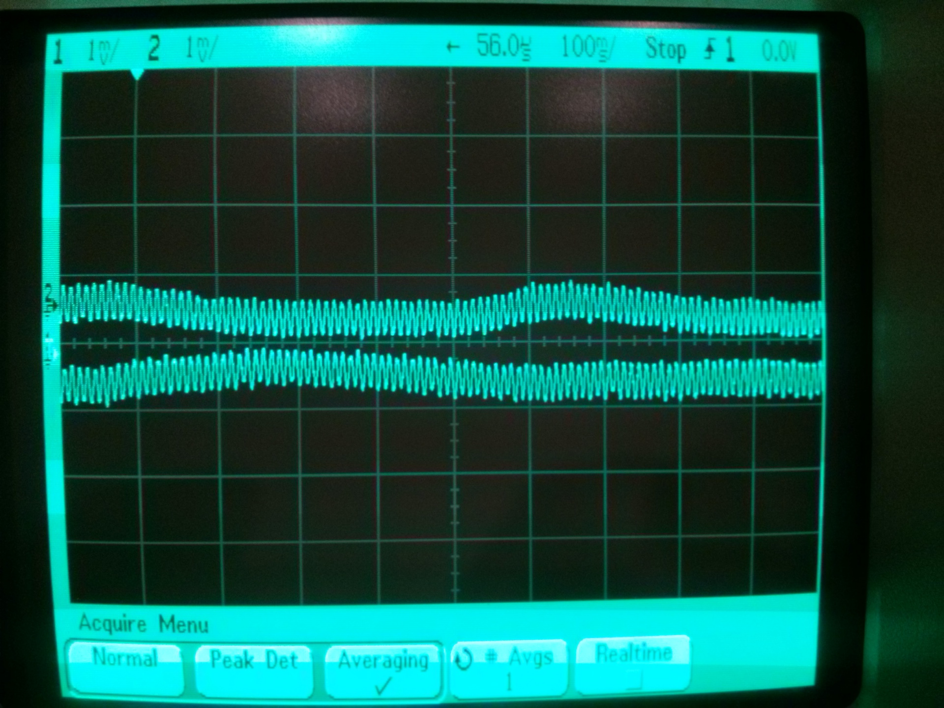 Miután szétkompenzáltam a stabilizátort és továbbra is egymástól függetlenül hullámzott kis frekvencián a két tápkimenet, gondoltam egy merészet és rábiggyesztettem az egyik kimenetre mindkét mérőcsúcsot. A szkóp két csatornája nem egyforma. De nagyon nem. Ki gondolta volna, hogy már semmiben sem lehet megbízni.