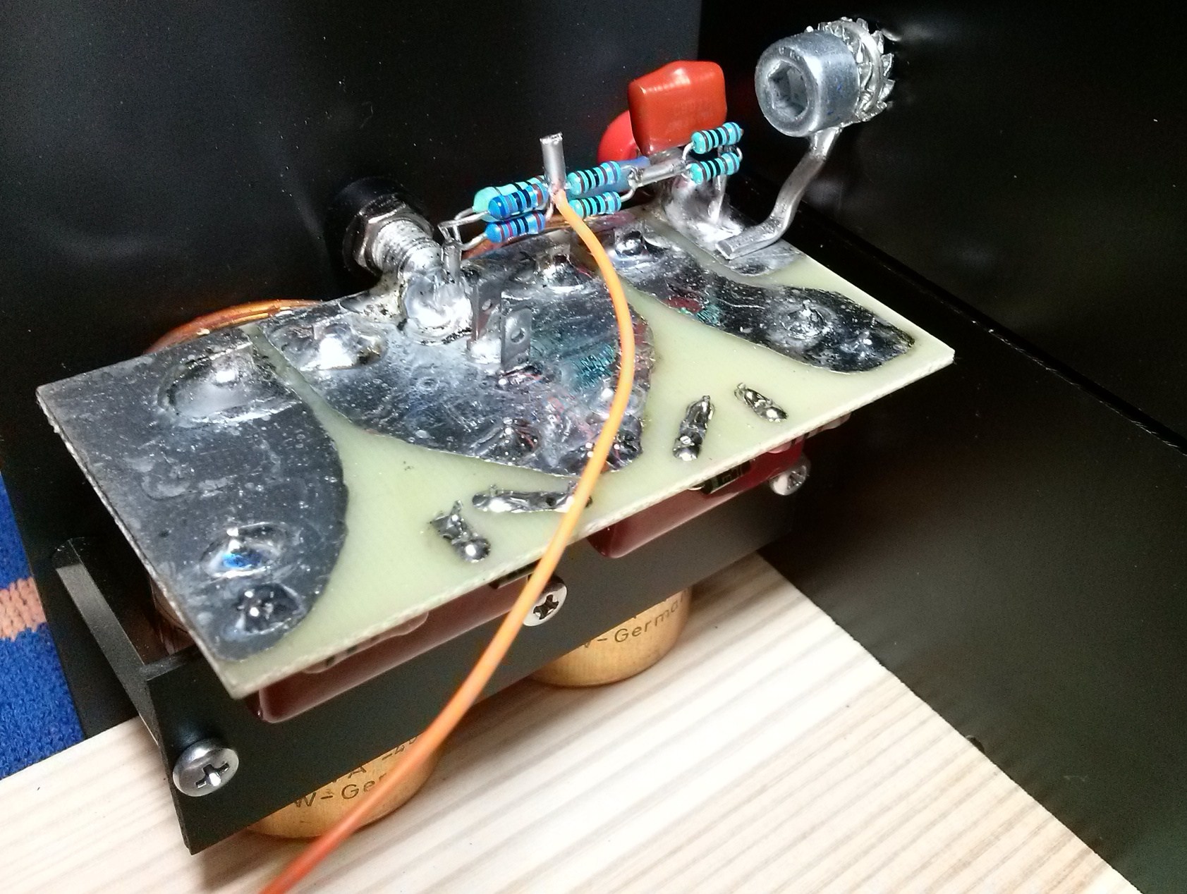 Csatlakozókhoz ennél közelebb rakni osztót szerintem már nem lehet. Nem szép, de legalább csúnya és praktikus. Az 1k-osak 15 ppm/C, 0.1%-osak, leolvadni biztos nem fognak, a hangjuk meg olyan lesz, amilyen. Nem szívesen cserélgetném őket.