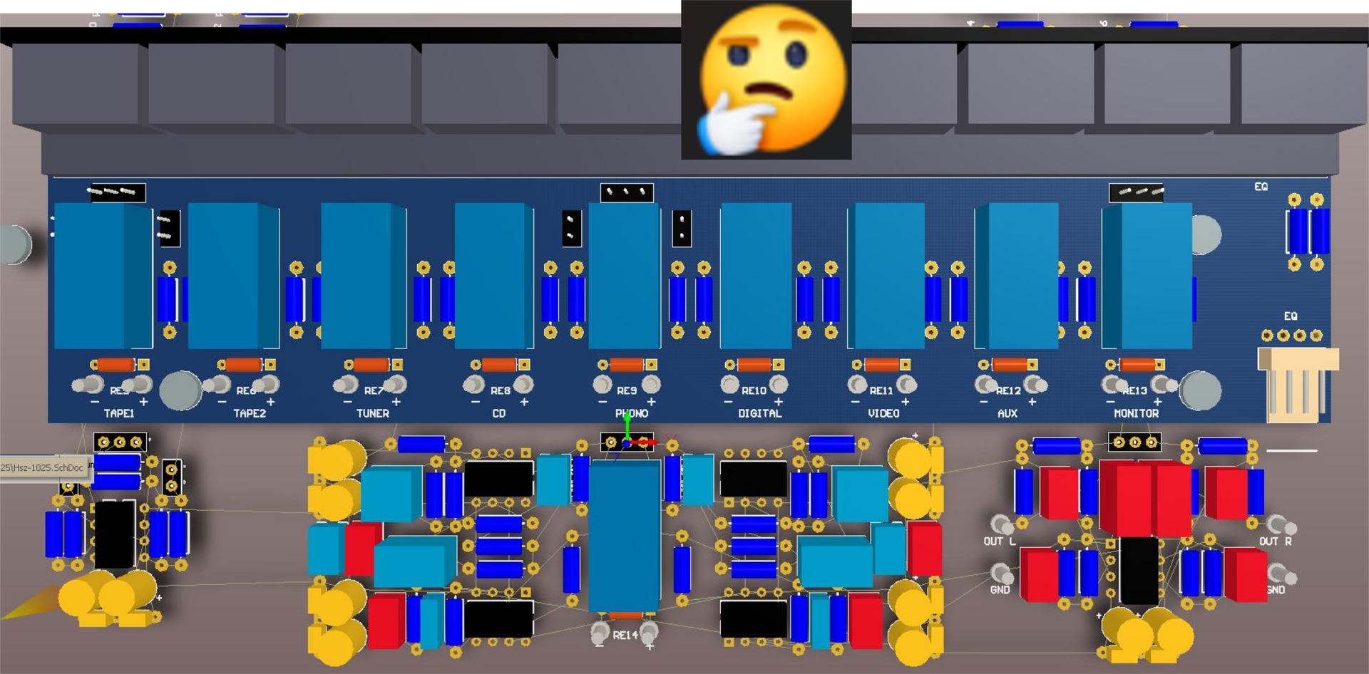 A kép alatti alkatrészkupac, az külön panel, amit felülről öcsipanelként dugok a kékségre. A kérdés az lenne, hogy a GND-t egy ponton vigyem a felső panelra, vagy egységenként a hármas berg tüskéken (Tape1, phono és monitor felirat alatt, valamint a relék felett lenne a csatlakozás.) Azaz, elég csak a melegpontokat felvinni és a GND-t csak egy helyen, vagy minden csatlakozónál vigyem fel. Márhogy ne legyen földhurok.