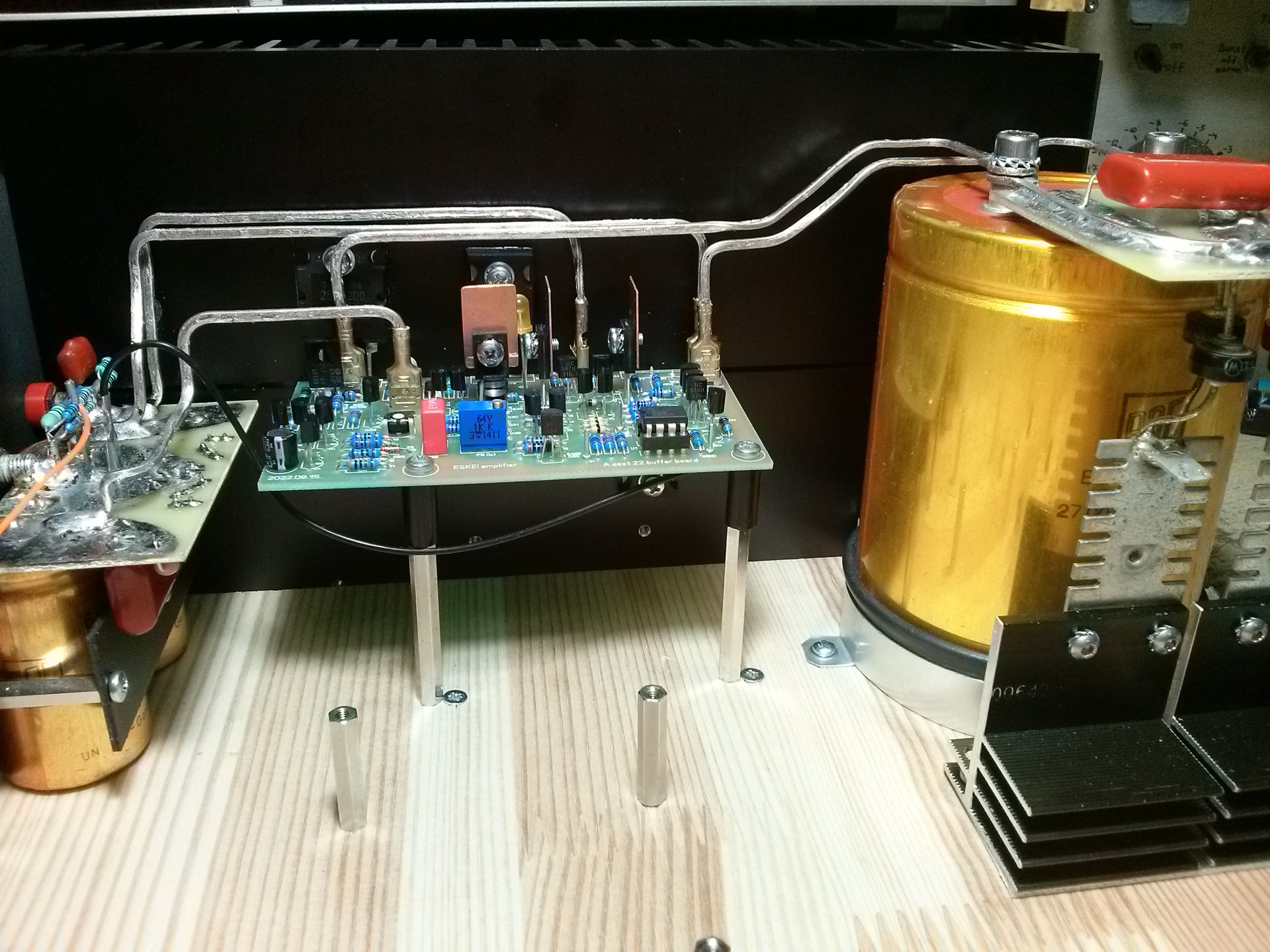 Bevezetékeztem a buffer fokozatot. Azért sem "speckábellel", meg aranyozott ezüst vezetékkel, hanem csak azzal amit a fiókban találtam (jó sok fiókom van) és ebből is jó hosszúval, hogy az is rontson a hangján - mert ha most megcsinálom a "világ legjobb erősítőjét" akkor mit fogok csinálni jövőre, vagy esetleg húsz év múlva : )