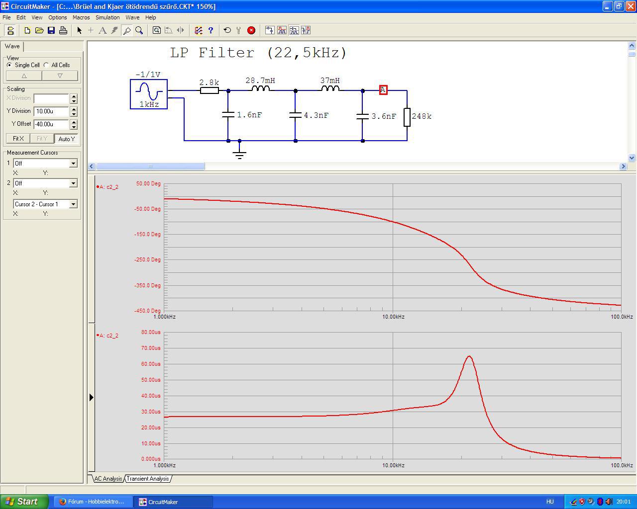 1969-ben készült az első változata ennek az erősítőnek (oda van írva, onnan tudom). Akkor talán még számológép sem volt. Már régebben leszimuláltam ezt a 22.5 kHz-es aluláteresztőt. Elképesztő. Szerintem. Számomra. És ez a gyakorlatban is ilyen. 22 kHz-ig teljesen lineáris az átvitel, majd kicsit feljebb nyomtalanul eltűnik a jel.