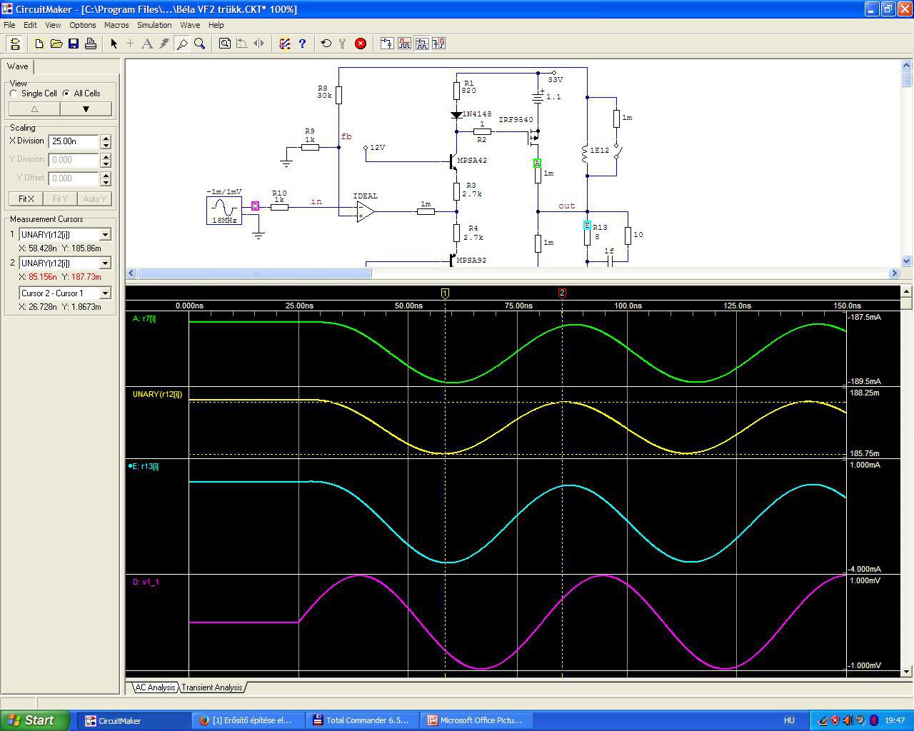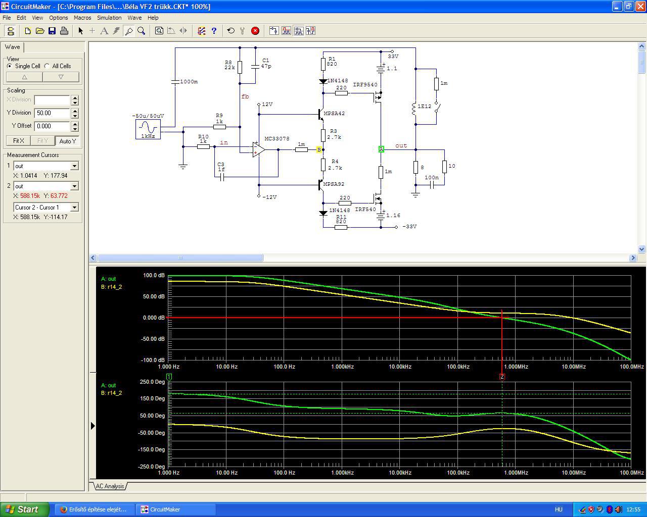 Nem sok időm van,de a fejemben ez volt hajnalban. Képet is teszek, hogy akinek nincs CM, az is lássa. A lényeg, hogy a kimeneti fokozat erősítését fogtam meg egy helyi visszacsatolással, így mind a kimeneti impedancia csökkent, mind a gerjedékenység.
