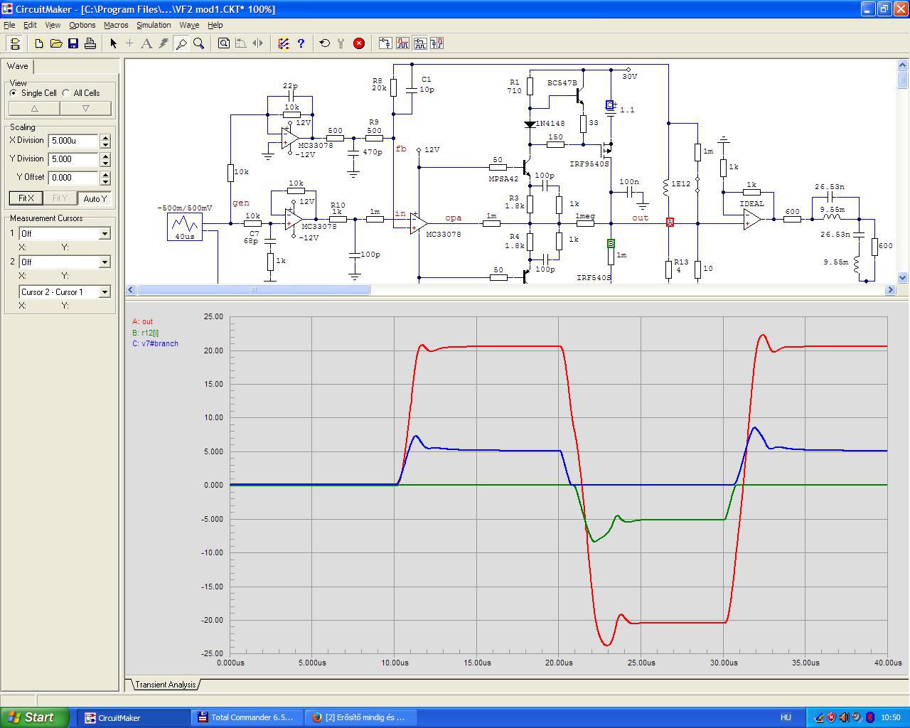 Az opampnak túl kell lőnie, mert az tölti be a fet kapacitásait. Nekem csak IRF9/540-em van itthon, ezért egyelőre ezzel szimulálok. Az R31 is jó ötlet, az kell oda. Próbáld meg betenni C9, C10-et és környékét, akkor mit mutat. |