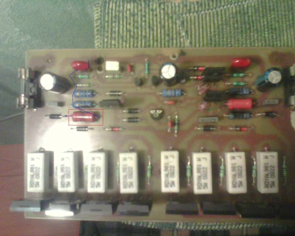 Ahol fel van égve a fóliacsík az az ellenállás most nem melegszik jel nélkül. A kimeneten DC nincs. A négyzettel jelölt melegedő ellenállástól a 3. ellenállás egy 62K-os darab. Ez hozzá van kötve az ELKO - jához és a melegedő ellenállás és a kondi közé van kötve (az a kondi ami a test és a meleg ellenállás között van). A 62K másik fele a két BC tranyó emiterjéhez van kötve.