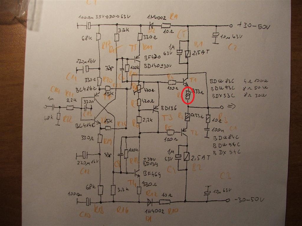 Az egyik oldalon több mint -1V van nyugalomban a kimeneten és a megjelölt emitter ellenálláson is negatív feszültséget mérek, ami szerintem csak akkor fordulhat elő, ha T1 végtranyó nem nyit ki, pedig a T5 meghajtó tranyója melegszik. Hol lehet a gond? Másik probléma, hogy búg, már kipróbáltam külön a két oldalt, de nem ez volt a gond. Köttem mindent mindenhova, konnektor földje, gnd csillagpont, hűtőborda ezek minden kombinációban össze lettek kötve, de semmi, bemeneten 50k-s log poti van, két végállásában a leghangosabb a búgás. A táp rendesen meg van szűrve oldalanként 2x4700µF +100nF.