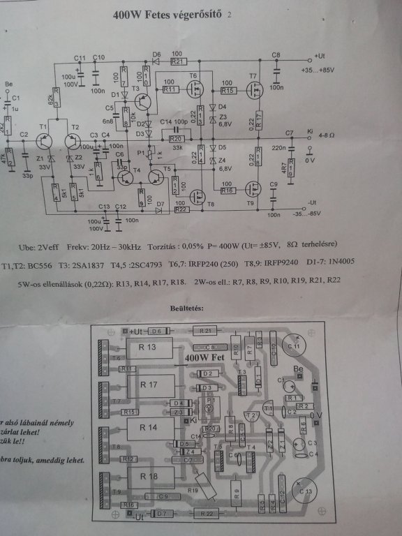 Segítséget szeretnék kérni. Van egy erősítőm amiben a fetek zárlatoltak a hűtőbordával (IRFP9240, IRFP240) és két ellenállás (R15 R11) elfüstölt illetve még diódák (Z3 D4) is. Kapott uj feteket (irfp9240, irfp240) illetve ellenállást, diódákat, a többi alkatrészt jónak találtam. Bemenő jel és hangszóró nélkül rámértem és -65V jelenik meg a kimeneten. +-65V ról üzemel. Van valami ötletetek?